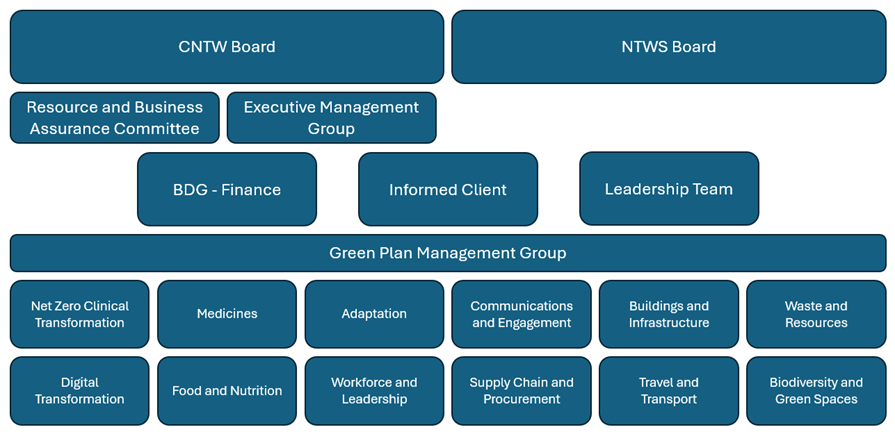 This is the central committee responsible for monitoring our performance both in terms of tracking our carbon emissions against national targets and progress towards the actions set out in our Green Plan for each area of focus. The group is chaired by our Board-level Net Zero Leads and membership consists of the Net Zero Programme Lead and strategic leads for each area of work (see Figure 7). Meetings are held quarterly, and the group delivers onward progress reports to the CNTW BDG- Finance group and NTW Solutions Leadership Team throughout the year, and the Annual Green Plan Delivery Report onwards to Trust and NTW Solutions Boards.